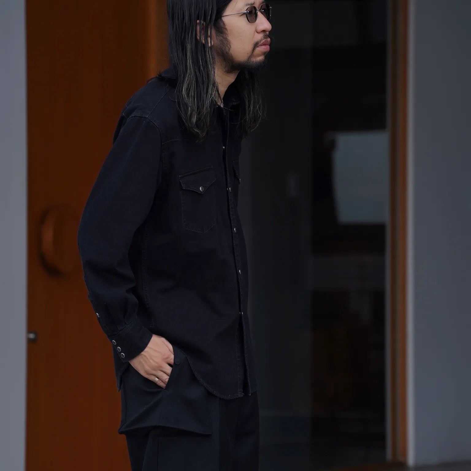 中に着ていたのは、ブラックデニム生地のウエスタンシャツ。